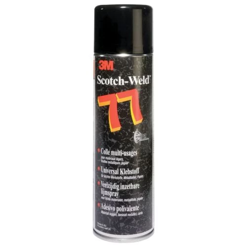 La colle aérosol 3M 77 est une colle polyvalente avec un fort tack initial, haut pouvoir couvrant (la colle s’étend sur les surfaces et pénètre peu les matériaux poreux) et se sèche rapidement. Elle permet le collage de polystyrène expansé sans l’attaquer et s’adhère pratiquement sur la plupart des matériaux légers tels que le papier, liège, tissu, feutre, caoutchouc sur métal, bois, verre, céramique, plâtre, laine de verre. Cette colle multi-usage 3M™ 77 est couramment utilisé pour le maintien de toiles de fond dans les studios photo et pour l’assemblage de la mousse de polystyrène dans la réalisation d’unités d’emballage.