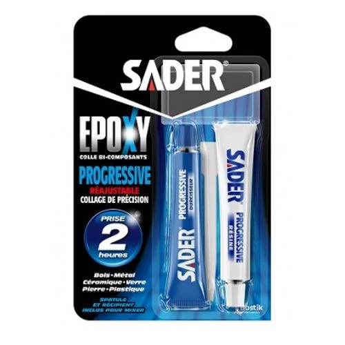 La colle Epoxy Progressive de la marque Sader est une colle bi-composante durable conçue pour les collages mĂ©ticuleux, car elle est ajustable pendant les deux heures qui suivent le mĂ©lange. Elle offre un collage puissant avec une rĂ©sistance finale de 130 kg / cmÂČ, et peut ĂȘtre utilisĂ©e en extĂ©rieur comme en intĂ©rieur. De plus, elle est rĂ©sistante Ă l’humiditĂ©, aux hautes tempĂ©ratures et aux hydrocarbures. En effet, cette colle s’utilise sur plusieurs types de matĂ©riaux : mĂ©tal, bois, cĂ©ramiques, plastique, verre, pierre, faĂŻence, bĂ©ton, marbre et bien d’autres encore.