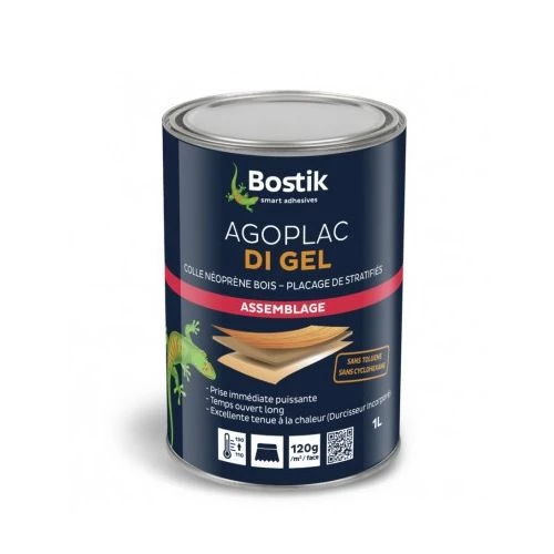 La colle néoprène Agoplac DI gel de Bostik est une colle contact gel, performante et de haute qualité. Elle est idéale pour les placages de stratifiés décoratifs sur supports rigides (agglomérés, bois…). Elle convient aussi aux assemblages de divers matériaux tels que : liège, bois, cuir, caoutchouc, mousses souples, polyéther et polyuréthane, feutres, ainsi que sur différents supports comme le bois, le ciment ou le métal. En revanche, elle n’est pas adaptée aux collages de PVC plastifié et de polystyrène expansé. Cette colle est très résistante à la haute température grâce au durcisseur incorporé. Aucun risque d’irritations, car elle ne contient ni de toluène ni de cyclohexane.