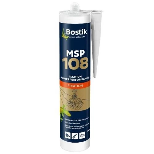 Le mastic MSP 108 de la marque Bostik bénéficie d’une prise initiale élevée permettant un maintien immédiat sans étayage et d’une résistance finale étant très élevée. Ce mastic ne dispose aucun solvant ni isocyanate mais a une très bonne résistance aux intempéries et aux rayons UV, lui conférant une excellente adhérence y compris sur supports humides non ruisselants.