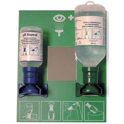 La station murale lave-œil mixte pour le soin des yeux de la marque Esculape contient une solution de pH neutre qui permette de neutraliser les acides et les alcalins en quelques secondes, et une solution stérile de chlorure de sodium qui permette le nettoyage et la réhydratation de l’œil jusqu’à l’intervention médicale. Elle convient ainsi pour un lavage des yeux en cas de projections d’acides ou de bases.